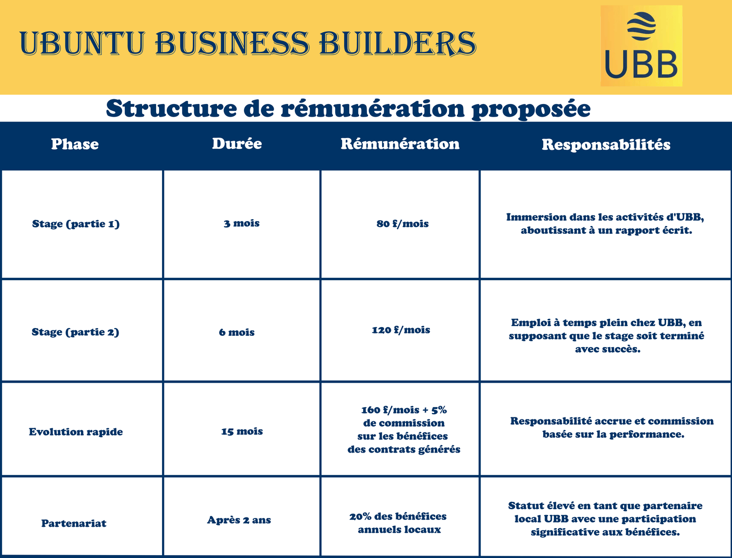 Ceci décrit le paquet de rémunération proposé aux personnes souhaitant devenir partenaires locaux UBB. Le paquet est conçu pour récompenser l'engagement, la performance et le succès, offrant un cheminement de carrière clair et une croissance financière au sein du réseau UBB.